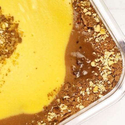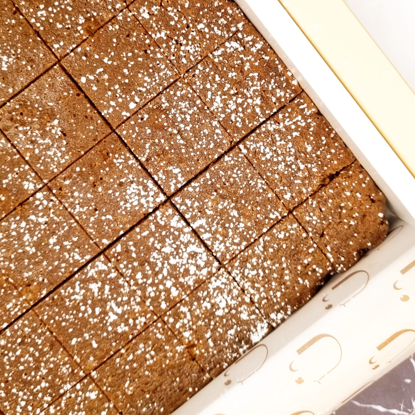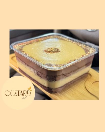 Layers of cake, cocoa sauce and our secret yellow sauce